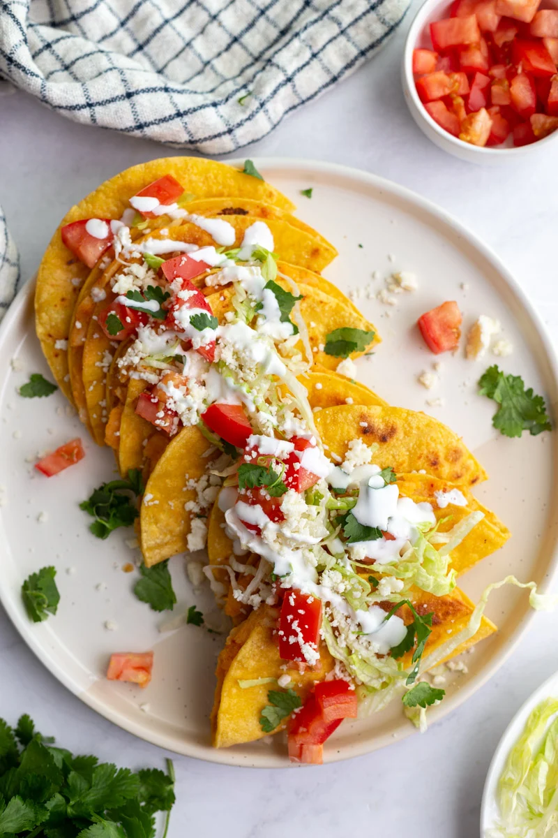 - Spoon crispy potatoes into each tortilla. Top with cabbage, pico de gallo, avocado, and cilantro.